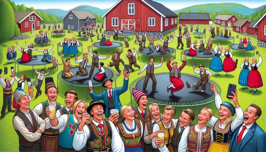 Bunad er kanskje vanlig på 17. mai, men visste du at flere norske småsteder har utviklet en konkurranse om å ta flest mulig selfies i løpet av dagen – helst på steder hvor folk (og bunader) vanligvis aldri ferdes? Vi snakker fjøset, trampolinen og, for den ekstra vågale, på taket til grendehuset. Ekstrapoeng for rare positurer og tilskuere i bakgrunnen. Skal det være, så skal det være med litt ekstra fargerik bunad-energi!